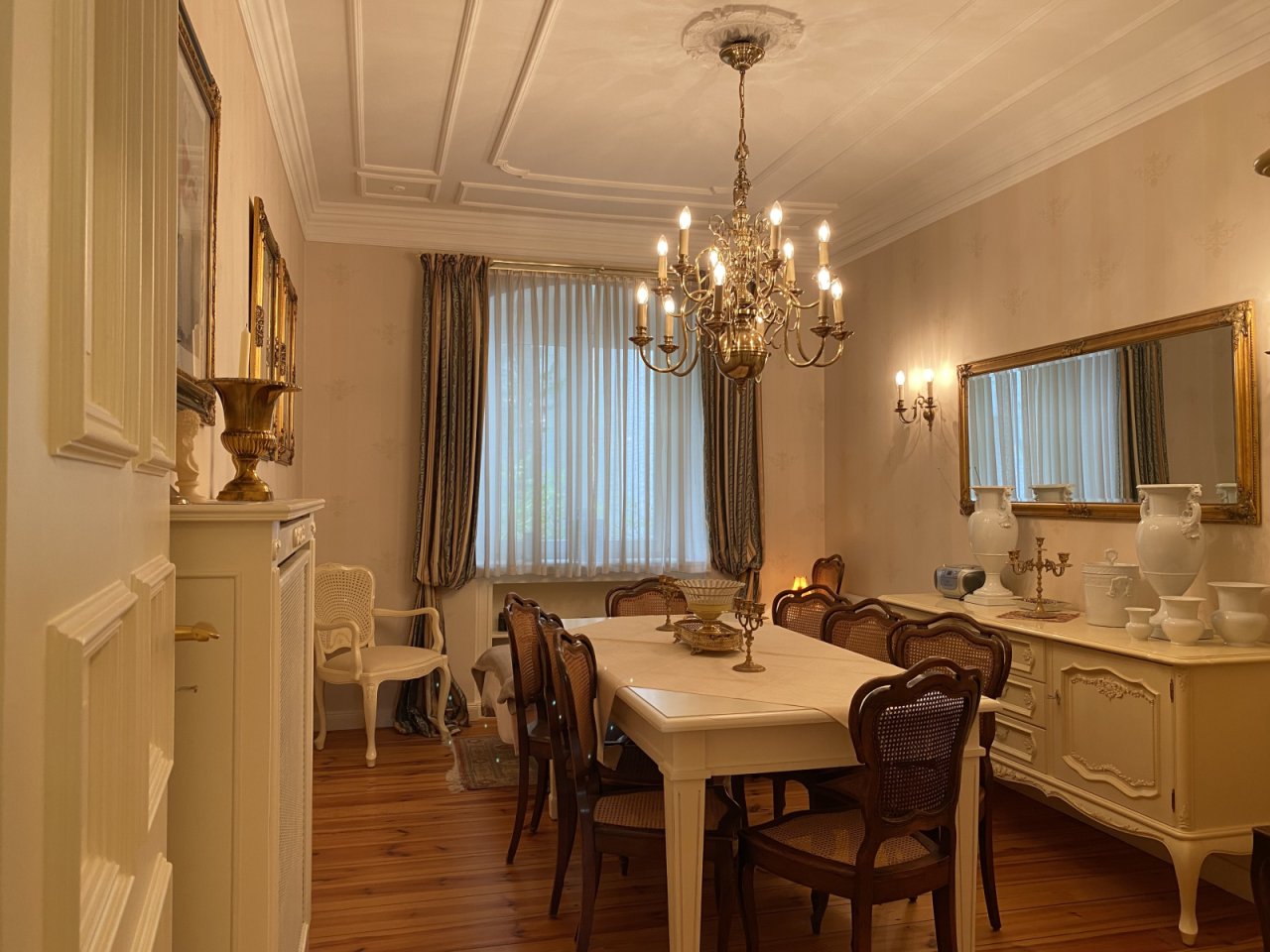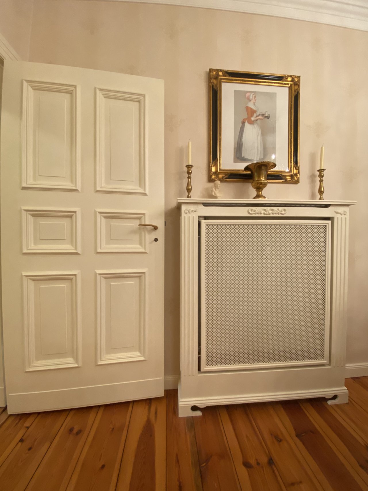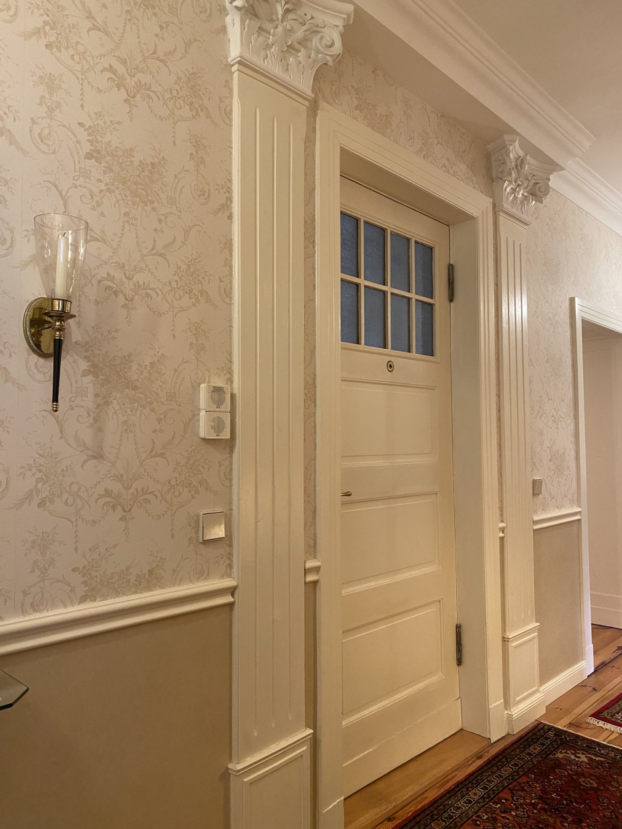 Besonderes Augenmerk lag jedoch auf die fachgerechte und sehr aufwendige Rekonstruktion von Türen und Einbauschränken, der Stuckverzierungen der hohen Decken und der aufwendigen Verkleidungen der Heizkörper. Mit sicherem Gespür für das Detail wurde das Farbkonzept der Räume und die Inneneinrichtung umgesetzt und lässt das Herz jedes Liebhabers des klassischen Stils höherschlagen.