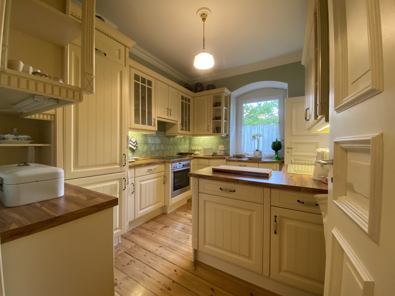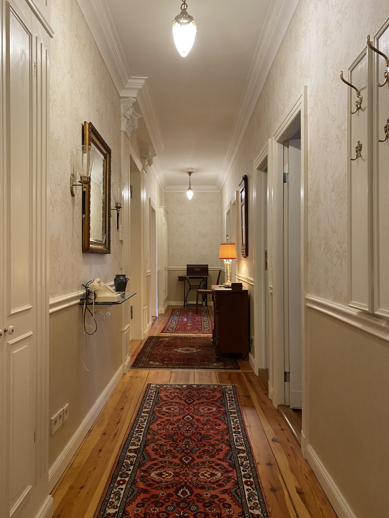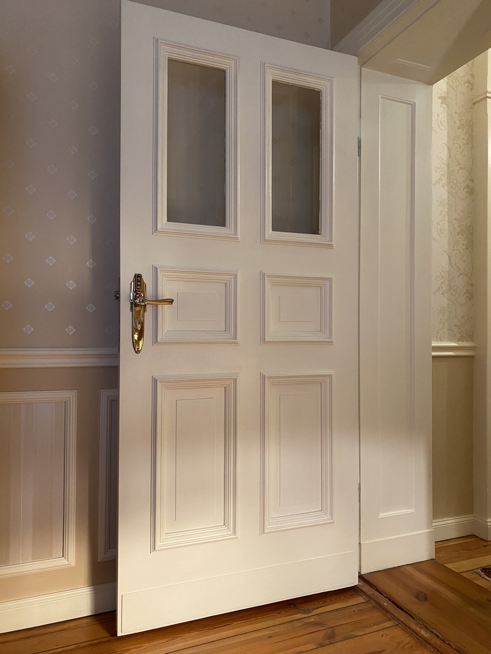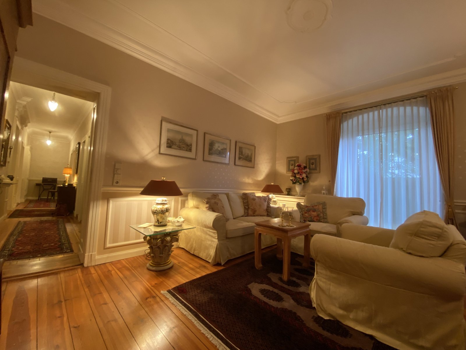 Besonderes Augenmerk lag jedoch auf die fachgerechte und sehr aufwendige Rekonstruktion von Türen und Einbauschränken, der Stuckverzierungen der hohen Decken und der aufwendigen Verkleidungen der Heizkörper. Mit sicherem Gespür für das Detail wurde das Farbkonzept der Räume und die Inneneinrichtung umgesetzt und lässt das Herz jedes Liebhabers des klassischen Stils höherschlagen.